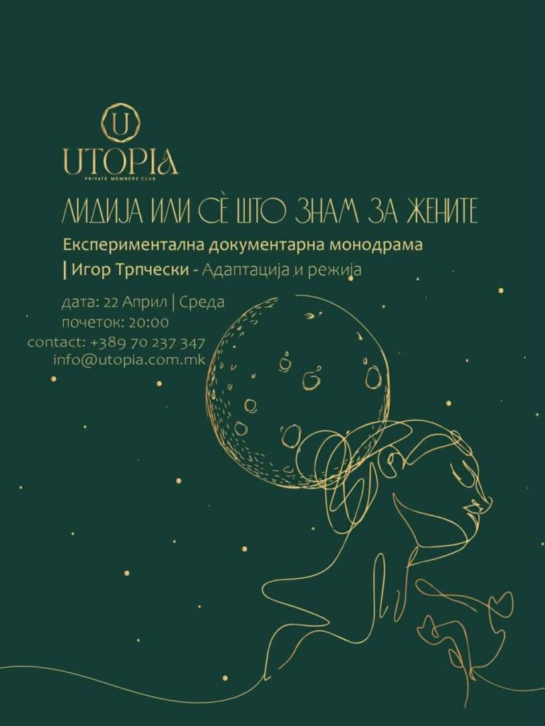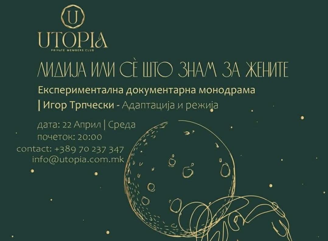 Битола се сеќава на Тихомир Јанчовски, а UTOPIA – местото каде што минатата година настапи ја продолжува таа меморија преку сцена. На 22 април, со почеток во 20:00 часот, во UTOPIA Private Business Club ќе се одигра монодрамата „Лидија или сè што знам за жените“, експериментална документарна форма базирана на поетскиот роман на Јанчовски. Оваа изведба има посебна тежина, не само како театарски чин, туку и како омаж на автор кој остави силна трага на современата книжевна и сценска мисла. Јанчовски беше препознатлив по својот автентичен израз, интимен пристап кон темите и способноста личното да го претвори во универзално.