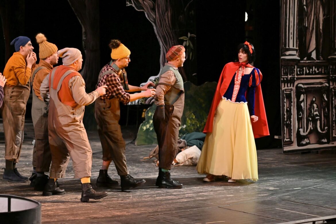 Ова е претстава и за децата и за возрасните. Во театарската изведба на ,,Снежана и седумте џуџиња“, публиката ќе биде сведок на борбата помеѓу доброто и злото, преплетена со хумор, емоции и музика . Секој лик -од прекрасната Снежана , низ мудрите и смешни џуџиња, до злобната кралица -оживува пред присутните, носејќи магија директно од бајката. Улогата на Снежана ја игра Ана Грамосли, а останатите улоги: Никола Стефанов, Јулијана Мирчевска, Катерина Аневска Дранговска, Борче Ѓаковски, Никола Пројчевски, Маријан Ѓоргиевски, Живко Борисовски, Александар Димитровски, Петар Спировски, Александар Копања и Марија Стефановска.Суфлер е Гордана Михајлова, инспициент Димитар Михајловски.