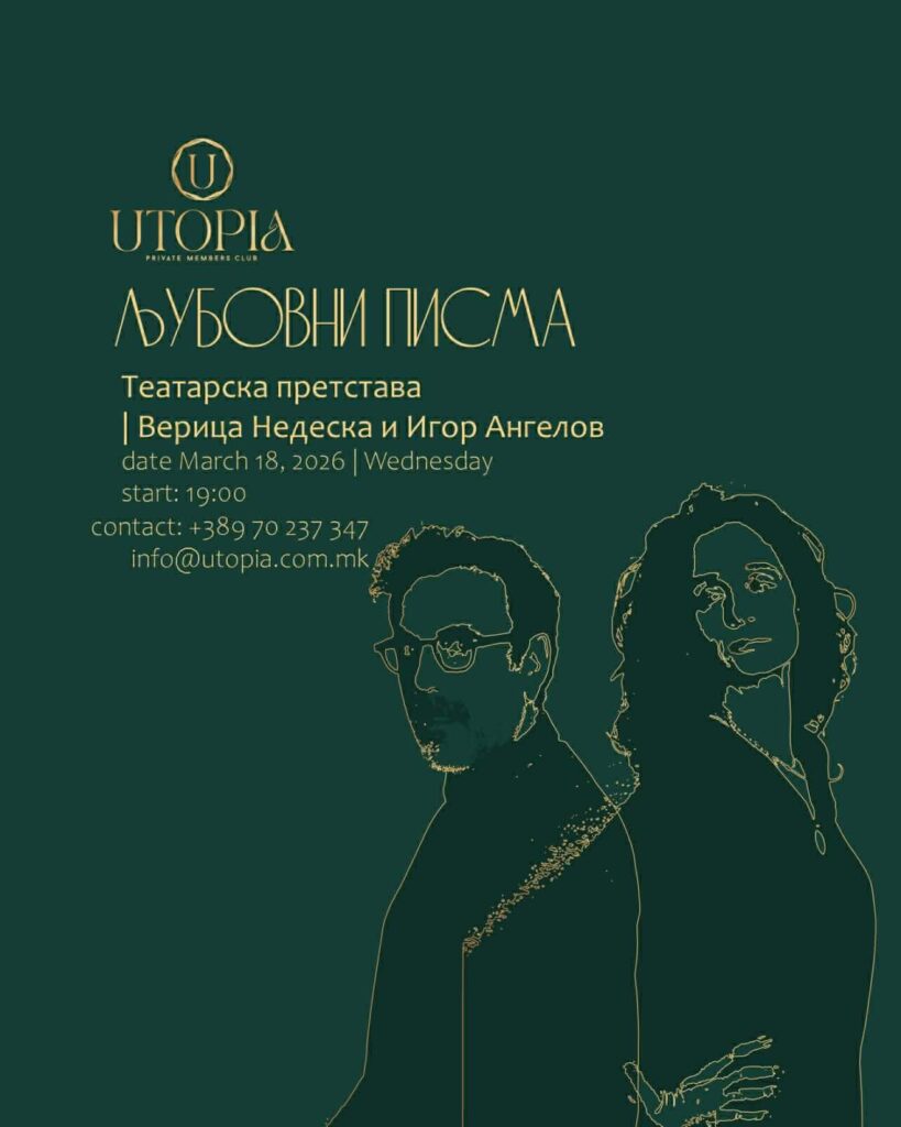 Во среда, на 18 март со почеток во 19:00 часот, во просторот на UTOPIA Private Business Club, ќе се одржи театарска вечер посветена на камерната дуо-драма „Љубовни писма“, во изведба на двајца исклучителни актери, Верица Недеска и Игор Ангелов. Оваа топла, суптилна и духовита претстава ја следи животната приказна на Томас и Алис, раскажана преку нивната долга преписка која трае речиси педесет години. Низ писмата, двајцата ликови го откриваат својот свет – соништата што ги имале, изборите што ги направиле, амбициите што ги воделе, но и грешките, пропаднатите бракови, воспитувањето на децата и тивките разочарувања што ги носи животот.