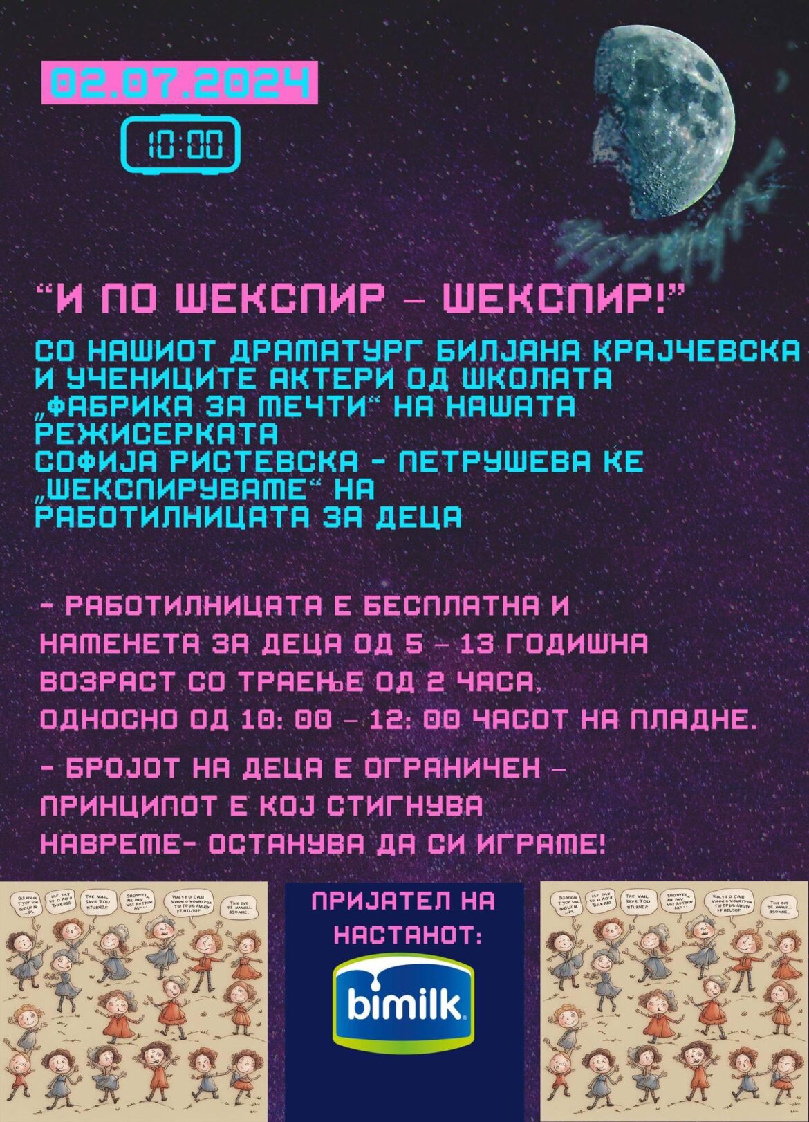 На 2. јули во 10 часот во Малата сала на Центарот за култура – Битола заедно со драматургот Билјана Крајчевска и учениците актери од школата „Фабрика за мечти“ на режисерката Софија Ристевска – Петрушева, ќе се„шекспирува“ на работилницата за деца „ И по Шекспир – Шекспир!“ Важно: · Работилницата е бесплатна и наменета за деца од 5 – 13 годишна возраст со траење од 2 часа, односно од 10: 00 – 12: 00 часот на пладне. · На децата не им треба претходно познавање на (сцените од) делата на Шекспир, всушност ние ги охрабруваме тие сами и на свој начин да ја откријат приказната. ·