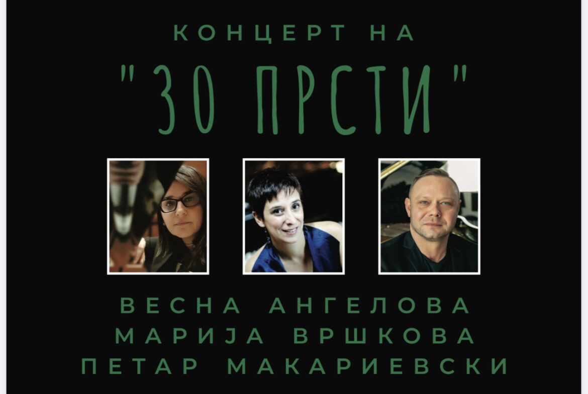 „Концерт за 30 прсти“ е насловот на настанот кој ќе се одржи на 18.05 во Културно информативниот центар, Офицерскиот дом во Битола. Пијанистите Марија Вршкова, Петар Макариевски и Весна Ангелова Христов, ќе изведат дела од композиторите Дачи, Шмиц, Рамазанов, Рајх/Боукоувалас, и од македонската композиторка Бете Илин.