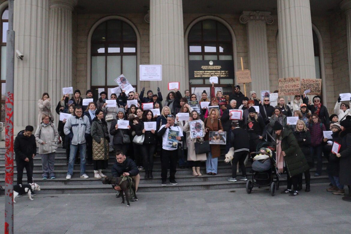 Поголем број на активисти за правата на животните, не само од Скопје туку и од другите македонски градови, одржаа мирен протест пред да почне судењето за обвинетиот Љубе Крстевски кој со стап го тепаше бездомното куче Феликс, а кое подоцна почина од повредите во стационарот за бездомни кучиња Лајка. „ За Феликс. За животните. За правна држава. За правда“, извикуваа тие.Активистите од судот побараа затворска казна за обвинетиот и поголема системска казнивост за оние кои малтретираат животни. Од здржението Анима Мунди најавија дека ќе поднесат и иницијатива до министерството за правда за воведување на нови кривични дела кои ќе опфаќаат малтретирање на животни како тоа за борба со кучиња и напуштање на миленици.„Убиството на Феликс нема да дозволиме да се заборави, премолчи, помине неказнето. Се мачеше 52 дена и умре, затоа што беше мирно бездомно куче кое не се ни обиде да се одбрани или нападне. Кое и покрај сето зло кое му беше нанесено, им веруваше на луѓето. Тука сме зошто бараме одговорност и затворски казни за сторителот и соучесниците. На овој ден поднесуваме ИНИЦИЈАТИВА ЗА ИЗМЕНА И ДОПОЛНА НА КРИВИЧНИОТ ЗАКОН до Владата: ресорното Министерство за Правда, со внесување на нови прецизно дефинирани категории – НОВИ КВАЛИФИКУВАНИ ФОРМИ НА КРИВИЧНО ДЕЛО МАЧЕЊЕ НА ЖИВОТНИ. Доколку некој се уште се прашува дали и зошто е тоа потребно, наведуваме неколку примери за кои располагаме и фотографии и/или видео материјали – ова се пријави кои ги имаме добиено во последните 10 дена: