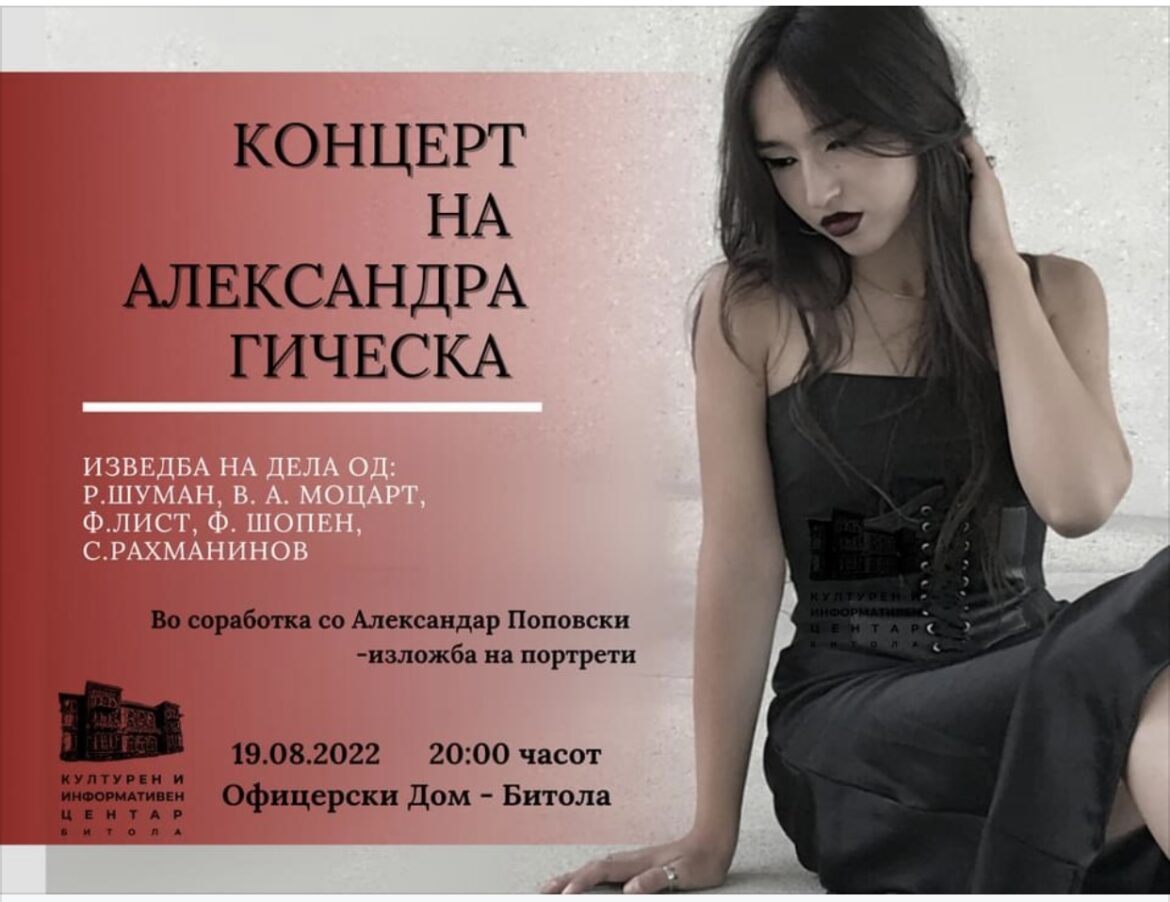 На 19-ти август со почеток од 20 часот, во Офицерскиот дом во Битола, ќе се одржи солистичкиот концерт на Александра Гическа. Таа ќе изведе дела од Р. Шуман, В. А. Моцарт, Ф. Шопен, Ф. Лист.