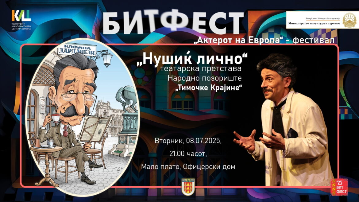 Битолското културно лето „БИТ ФЕСТ“, оваа недела ќе донесе интересни содржини за битолската публика. Денес, 08.07 од 21:00 часот на Бит Фест, на Малото плато пред Офицерски дом гостува театарската претстава „Нушиќ лично“ на Народно позориште „Тимочке Крајине“. Театарската претстава доаѓа од фестивалот „Актерот на Европа“. На 09.07.2025 со почеток од 21:00 часот, на Малото плато пред Офицерски дом ќе се одигра театарската претстава „Сега му е мајката“, во продукција на Алтернативен театар „Пробатон“ од Свети Николе.