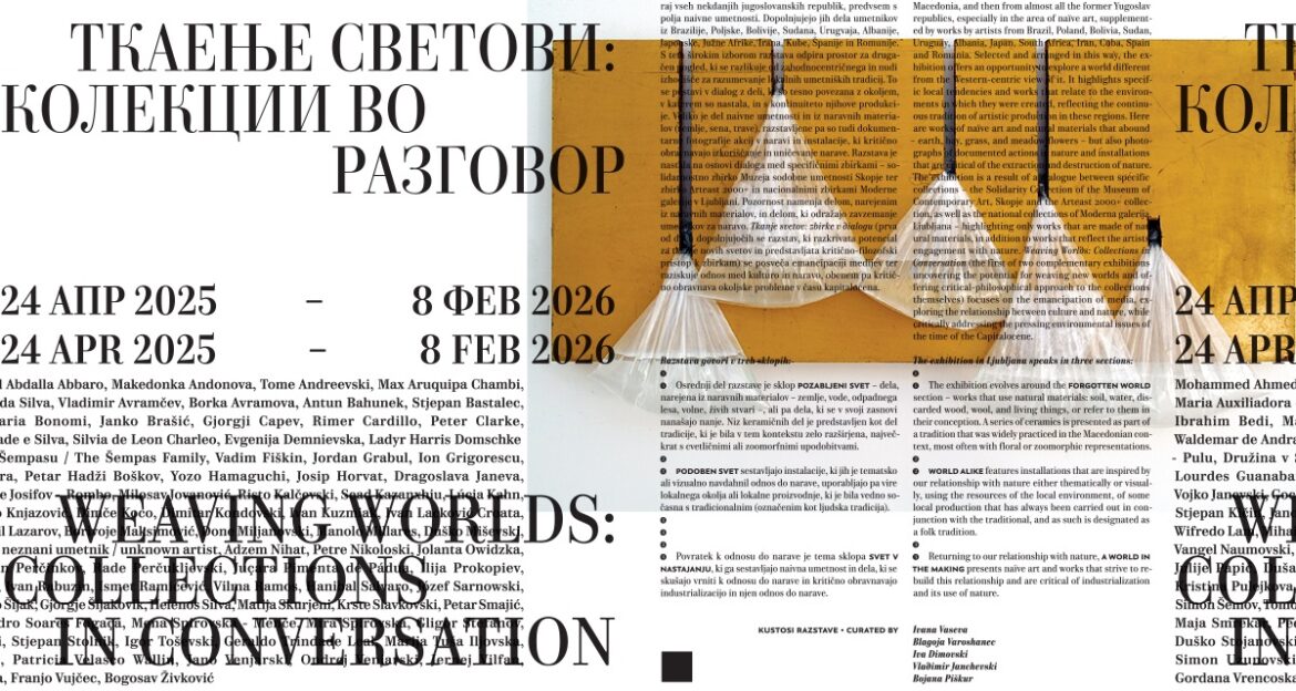 Отворањето на изложбата во Љубљана е закажано за 24 април во 20 часот и ќе трае до 8 февруари 2026 година. Наесен дел од колекциите на словенечкиот музеј ќе биде изложен во Скопје. Во „Ткаење светови: Колекции во разговор“ се застапени дела од македонските уметници: Борка Аврамова, Владимир Аврамчев, Македонка Андонова, Томе Андреевски, Ибрахим Беди, Гордана Вренцоска, Јордан Грабул, Евгенија Демниевска, Драгослава Јанева, Војко Јаневски, Гоце Јосифов – Ромбо, Ристо Калчевски, Димитар Кондовски, Димче Коцо, Михаил Лазаров, Доне Милјановски, Душко Мишевски, Вангел Наумовски, Петре Николоски, Аџем Нихат, Душан Перчинков, Раде Перчуклиевски, Илија Прокопиев, Кристина Пулејкова, Исмет Рамиќевиќ, Крсте Славковски, Мира Спировска, Мена Спировска-Менче, Глигор Стефанов, Душко Стојановски, Игор Тошевски, Марија Туша Иљовска, Симон Узуновски, Петар Хаџи Бошков, Ѓорѓи Цапев, Симон Шемов, Томо Шијак и Ѓорѓе Шијаковиќ, словенечките Јернеј Вилфан, Дружината од Шемпас, Маја Смрекар, Вадим Фишкин, потоа Стјепан Басталец, Антун Бахунек ,Фрањо Вујчец, Стјепан Кичин, Иван Кузмиак, Иван Лацковиќ-Кроата, Јулије Папиќ, Ханибал Салваро, Матија Скурјени, Петар Смајиќ, Иван Рабузин, Боривоје Максимовиќ, Стјепан Столник и Јосип Хорват од Хрватска, српските автори Јанко Брашиќ, Јано Вењарски, Oндреј Вењарски, Богосав Живковиќ, Милосав Јовановиќ, Јано Књазовиќ, Сеад Казанџиу од Албанија. Застапени се и Јоланта Овидска и Јузеф Сарновски од Полска, Јон Григореску од Романија, Маноло Милјарес од Шпанија, непознат автор од Иран, Вифредо Лам (Франција/Куба), Питер Кларк од Јужноафриканската Република, Мохамед Абдала Ахмед (Судан/Велика Британија), Ример Кардиљо од Уругвај, бразилските уметници Мариа Бономи, Валдемар де Андраде-Силва, Лухдес Гуанабара, Силвиа де Леон Чарлео, Ладир Харис Домше-Пулу, Луциа Кан, Мариа Осилијадора Силва, Жусара Пимента де Падуа, Еленос Силва, Педро Соарес Фогаса, Жералдо Триндаде Леал, Вилма Хамос, боливиските автори Макс Арукипа Чамби и Патриција Веласко Уалин и Јозо Хамагучи од Јапонија.
