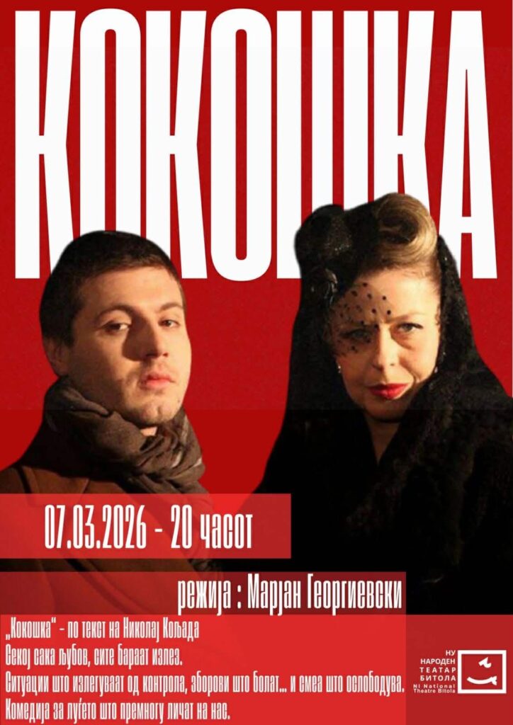 „Кокошка“ не е само комедија – таа е огледало на нашите карактери, суети, амбиции и апсурди. Со брилијантен хумор, живи дијалози и препознатливи ситуации, оваа претстава ја освојува публиката затоа што сите се пронаоѓаме во неа. Смеата доаѓа природно, искрено и – до солзи. Комедијата на авторот Николај Кољада, е во режија на Марјан Ѓоргиевски. Прифаќајќи ја драмата на својот живот како свој живот, неговите ликови создаваат можност да се прифатат себеси како луѓе, а со тоа и светот светот на сопствените можности како добар свет за себе. Во истата играат: Јулијана Мирчевска, Катерина Аневска Дранговска, Соња Ошавкова, Александар Димитровски, Никола Пројчевски. За сценографијата се погрижи Валентин Светозарев, костимографија Благој Мицевски, драматург Оливера Павловиќ, светло Игор Мицевски, тон Николче Терзиевски, инспициент Оливер Петровски. Ова е вечер за гласна смеа, добра енергија и театар што се памети. Ако сè уште не сте ја гледале – сега е вистинскиот момент. Билети по цена од само 100 денари, исклучиво на билетарата на Битолскиот театар.